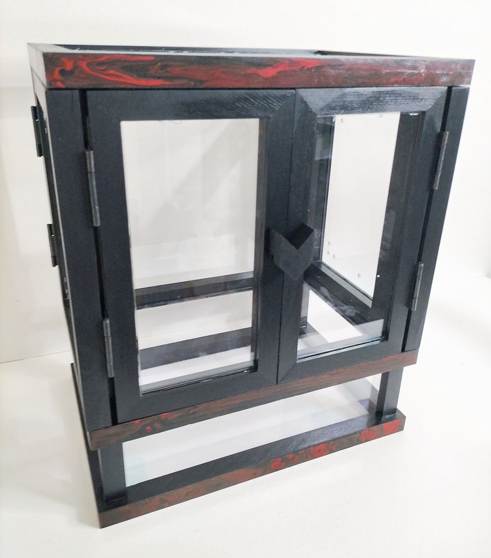This was a collaboration with the one and only, Steve Thornton from 'Tarantula Tastic Enclosures' https://www.facebook.com/profile.php?id=100053947106076 and was created for a charity raffle. The funds raised was donated to the National Autistic Society. I thoroughly enjoyed this project, especially working with Steve who did the internal build. When I saw the finish, I was gobsmacked by what he had achieved. It definitely elevated the whole design. Do check him out on all platforms, especially if you would like to learn how to setup your enclosures. He does tutorials that are very informative and easy to follow. The Nclosure is an arboreal design with a pair of double bi-fold doors, which was a crazy idea that ended up being a very unique and stylish show off piece. Currently the design is a one off, due to the complexity of the build and finish. The finish is a custom paint job and was achieved by using pouring acrylic paint. Very time consuming!